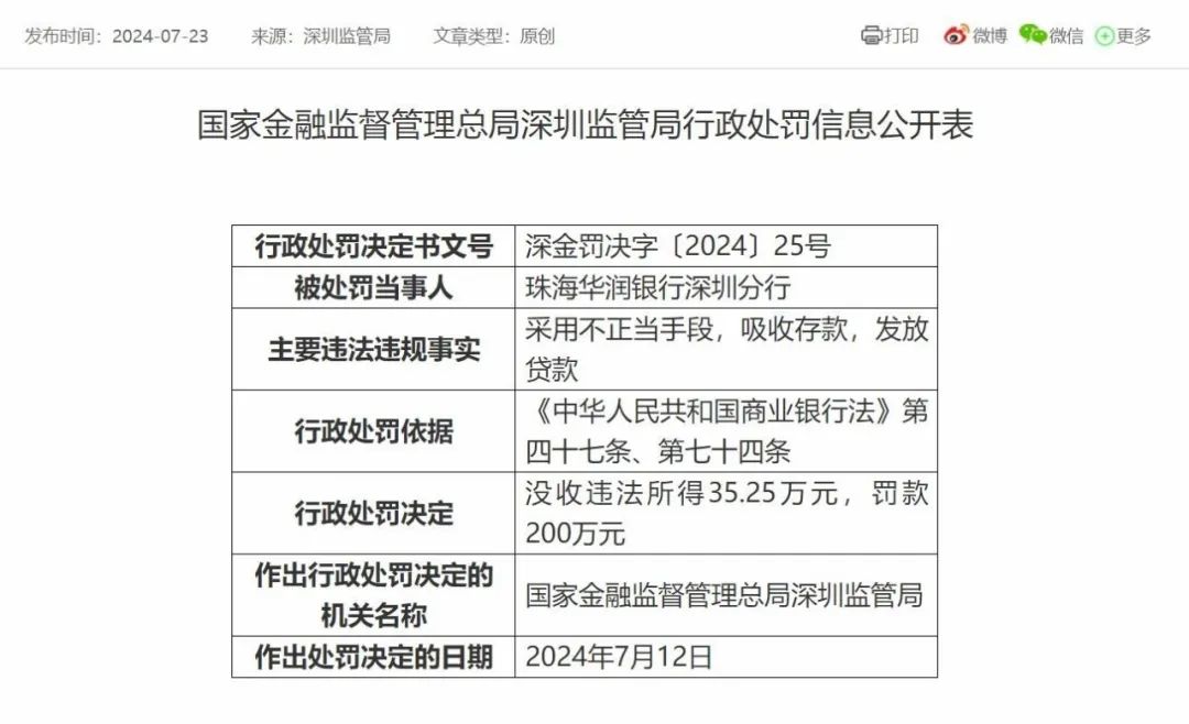 近日,国家金融监督管理总局深圳监管局发布行政处罚信息,珠海华润银行深圳分行因“采用不正当手段,吸收存款,发放贷款”,根据《中华人民共和国商业银行法》第四十七条、第七十四条,没收违法所得32.25万元,罚款200万元。