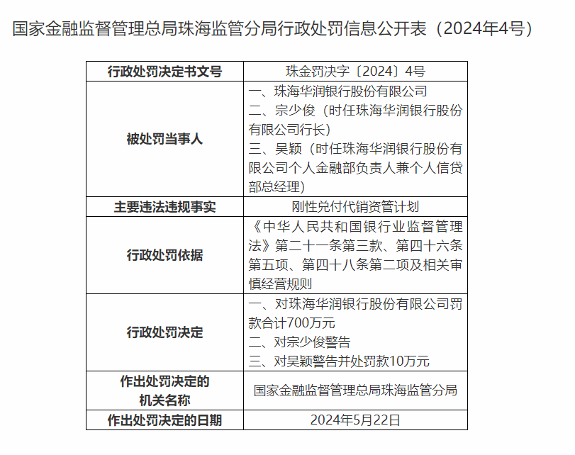 今年5月22日,因刚性兑付代销资管计划,华润银行收到成立以来最大罚单,被罚款700万元。