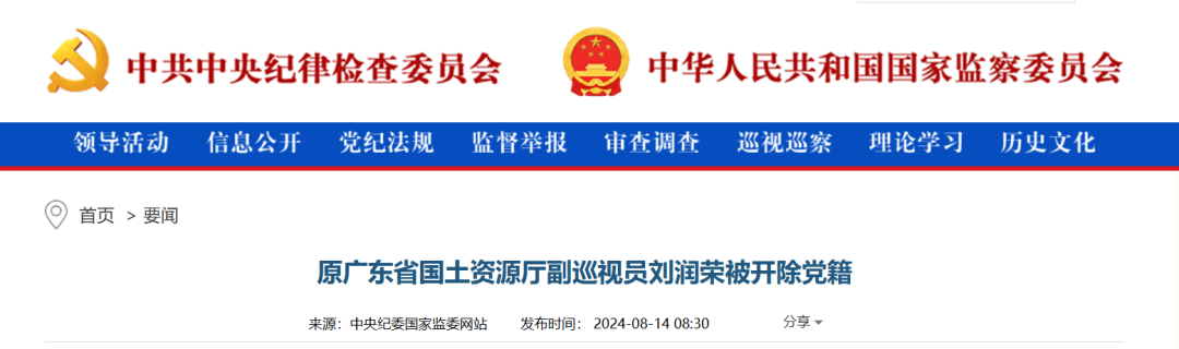 中央纪委国家监委网站8月14日消息,据广东省纪委监委消息:日前,经广东省委批准,广东省纪委监委对原广东省国土资源厅副巡视员刘润荣严重违纪违法问题进行了立案审查调查。