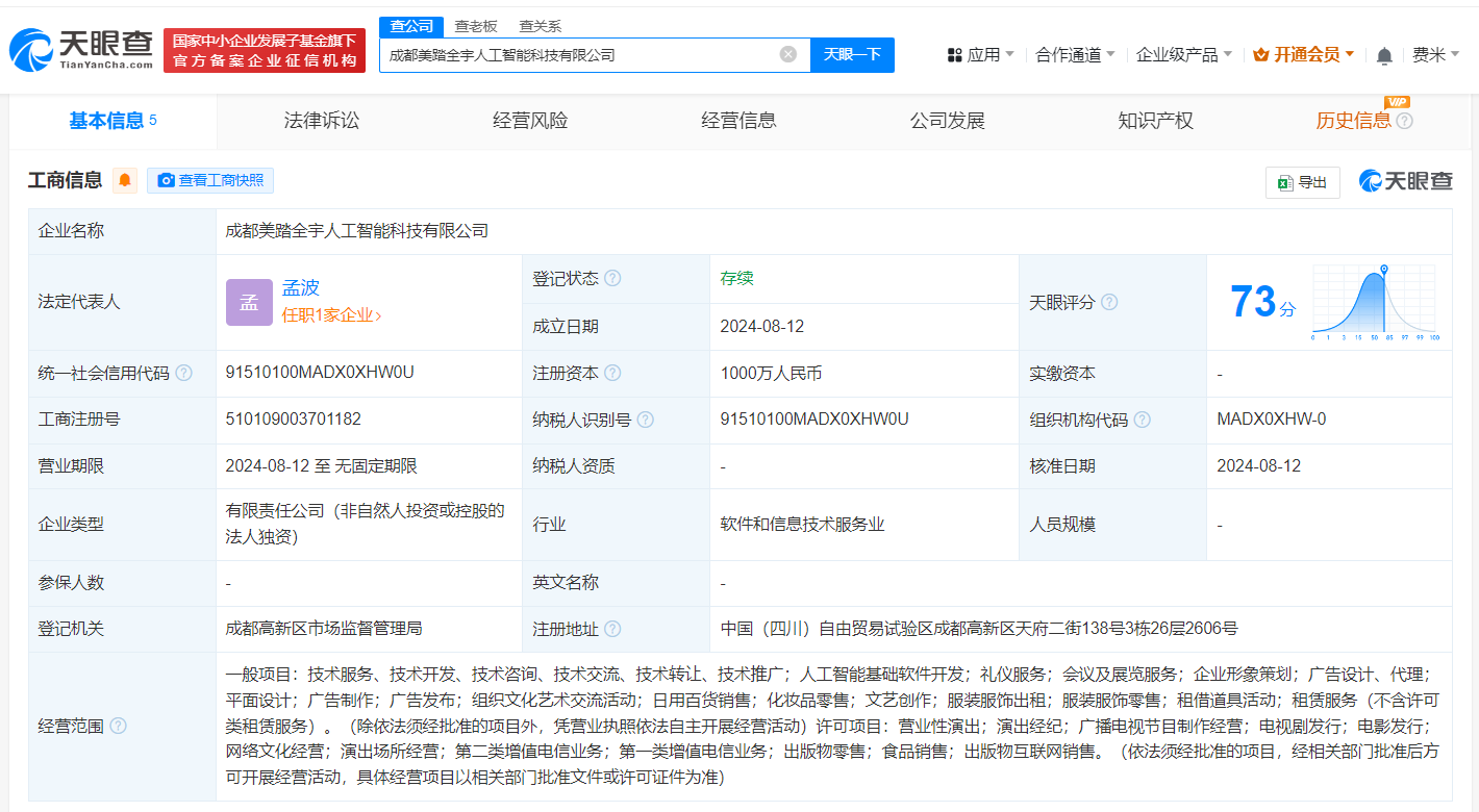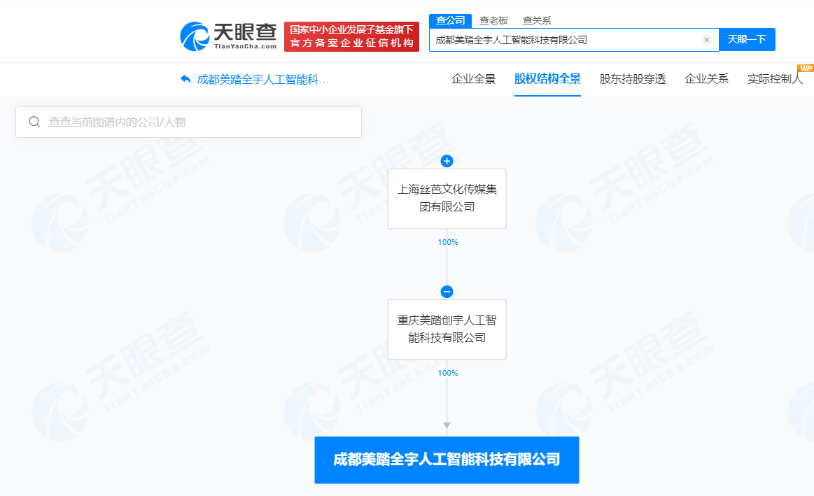 天眼查App显示,近日,成都美踏全宇人工智能科技有限公司成立,法定代表人为孟波,注册资本1000万人民币,经营范围含人工智能基础软件开发、礼仪服务、会议及展览服务、企业形象策划、组织文化艺术交流活动等。股权全景穿透图显示,该公司由重庆美踏创宇人工智能科技有限公司全资持股,后者为上海丝芭文化传媒集团有限公司全资子公司。