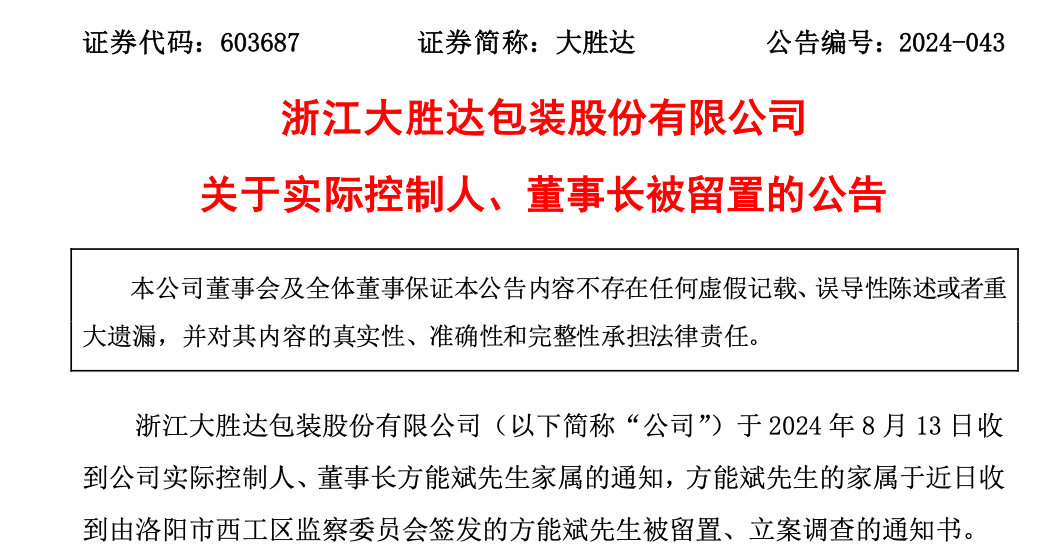 8月13日晚间,浙江包装业龙头大胜达公告,公司于2024年8月13日收到公司实际控制人、董事长方能斌家属的通知,方能斌的家属于近日收到由洛阳市西工区监察委员会签发的方能斌先生被留置、立案调查的通知书。