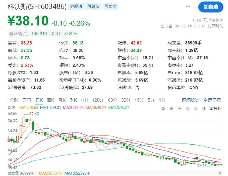 截至8月13日收盘,科沃斯微跌0.26%,报38.10元/股。