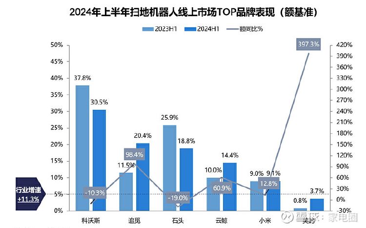 今年,扫地机器人市场的高端化趋势进一步发展,行业龙头品牌承压明显,以追觅、云鲸、小米等为代表的品牌迅猛增长。例如,追觅扫地机器人延续高增长态势,在今年上半年市场份额达20.4%,提升至市场第二,零售额同比增长高达98.4%,远超行业11.3%的平均增速,为TOP5品牌中高增速第一。