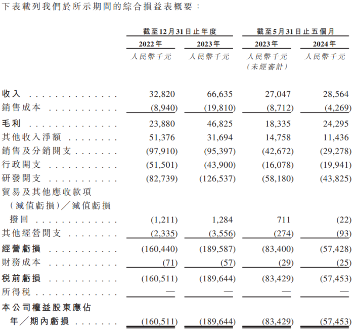 尽管收入持续增长,近年来,华昊中天仍处于亏损状态。公司自成立以来的各个期间均产生亏损及经营现金流出净额。2022年、2023年及2024年前5月,该公司分别录得亏损1.61亿元、1.9亿元及5745.3万元。“我们预期在可预见未来将继续产生亏损,预期该等亏损会增加,原因是将继续拓展对产品及候选产品的研发,同时增加销售及营销投入。”