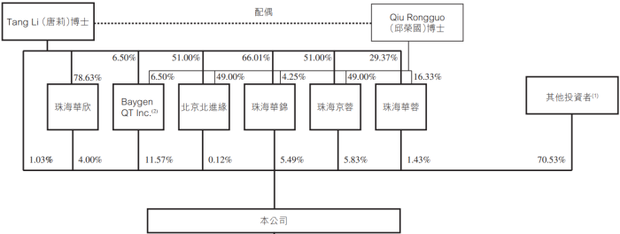 因此,唐莉及其配偶邱荣国、BaygenQTInc.、北京北进缘、珠海华欣、珠海华锦、珠海京蓉及珠海华蓉合计有权行使本公司约29.47%(略低于30%)投票权,并构成单一最大股东组别。唐莉目前任职公司董事长兼首席科学家、首席营销官。