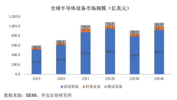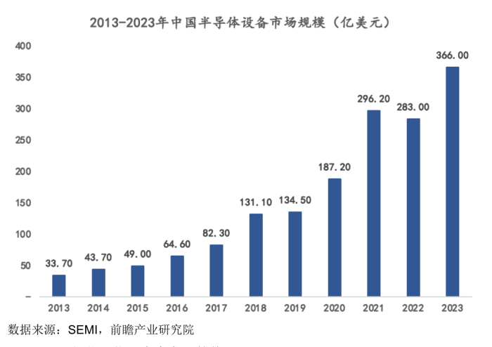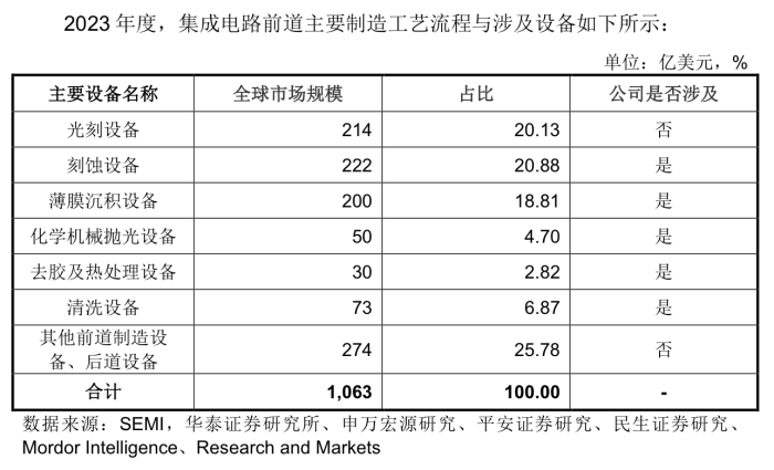来源:说明书据悉,半导体设备在产业链中的应用领域主要可分为两大类:前道晶圆制造和后道封装测试。根据SEMI发布的数据,全球半导体设备市场规模到2024年将增长至1071.6亿美元。其中前道晶圆制造流程,是芯片制造中最为核心的环节,前道设备占据了整个市场的80%-85%。而前道设备涉及的主要设备中,刻蚀技术和薄膜沉积技术与光刻技术并称三大主要生产技术。先锋精科产品涉及其二。