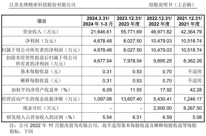 封锁“锁住了”下游的需求根据说明书,先锋精科2021年至2024年一季度的营业收入分别为4.24亿元、4.7亿元、5.58亿元、2.16亿元;净利润分别为1.05亿元、1.05亿元、8027.5万元、4678.48万元;扣非净利润分别为8362.26万元、9895.25万元、7978.54万元、4677.54万元。2023年公司研发投入占营业收入比例为6.51%。公司在2021年和2022年分别进行了8267.5万元、2500万元的现金分红。