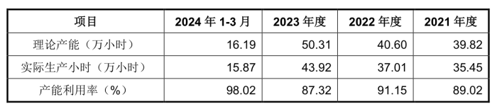 来源:说明书数据显示,2023年先锋精科理论产能50.31万小时,实际生产小时32.92万小时,产能利用率87.32%;2024年一季度的产能利用率为98.02%。