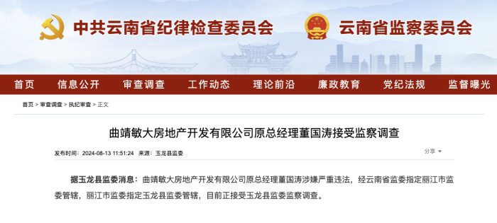 8月13日,据玉龙县监委消息:曲靖敏大房地产开发有限公司原总经理董国涛涉嫌严重违法,经云南省监委指定丽江市监委管辖,丽江市监委指定玉龙县监委管辖,目前正接受玉龙县监委监察调查。