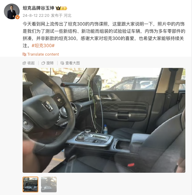 8月12日晚,长城汽车旗下坦克品牌执行副总经理谷玉坤在微博发文,回应网传坦克300内饰谍照。谷玉坤称,“照片中的内饰是我们为了测试一些新结构、新功能而组装的试验验证车辆,内饰为多车零部件的拼凑,并非新款的坦克300。”