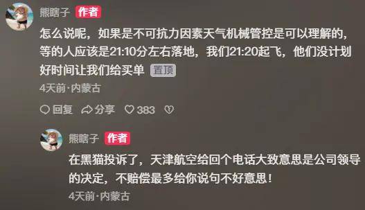 该网友表示:“如果是不可抗力因素,或者管制所导致的延误,自己是可以理解的,但自己无法为一名有自主能力的成年人的错误行为所买单。”随即,他还表示自己在投诉后,天津航空的领导决定,不对自己进行赔偿,最多说句不好意思。