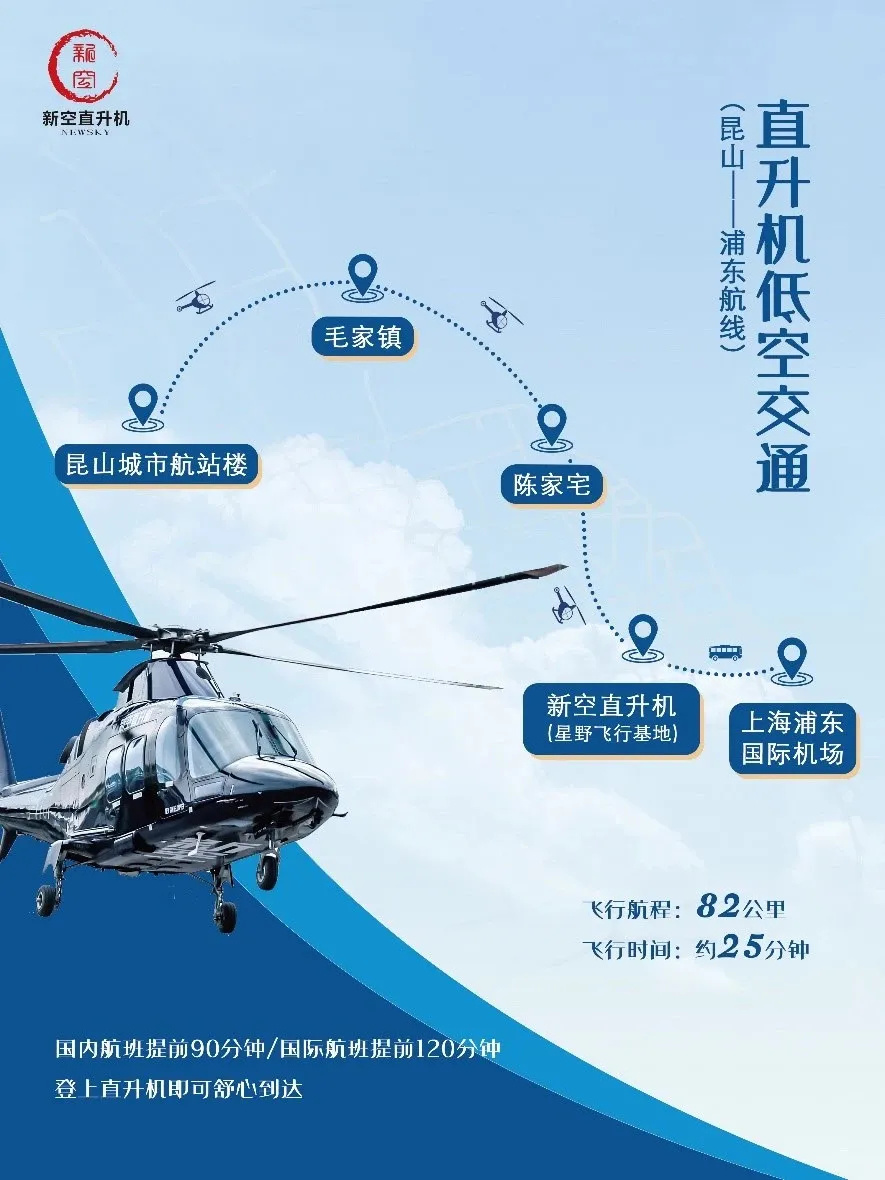 负责此次飞行任务的上海新空直升机有限公司是经中国民用航空局批准成立的通用航空企业。该服务尚处市场推广阶段,单程执飞价格按1600元/位、1800元/位设定,乘客乘坐直升机从昆山城市航站楼出发,20多分钟抵达上海浦东起降点,随后由浦东机场的地服专车转送至民航航班,算上机场地面接驳时间,全程控制在1小时以内。