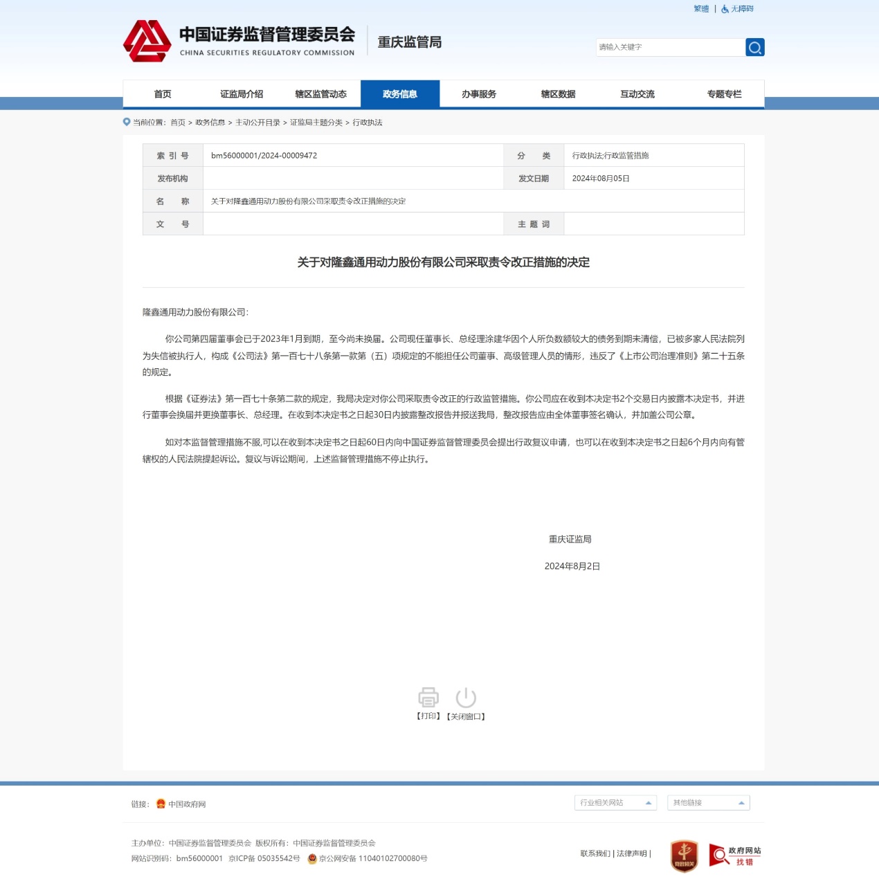 8月3日,隆鑫通用发布公告称,公司于8月2日收到中国证监会重庆监管局(下称“重庆证监局”)出具的《关于对隆鑫通用动力股份有限公司采取责令改正措施的决定》(【2024】21号,下称《决定书》)。