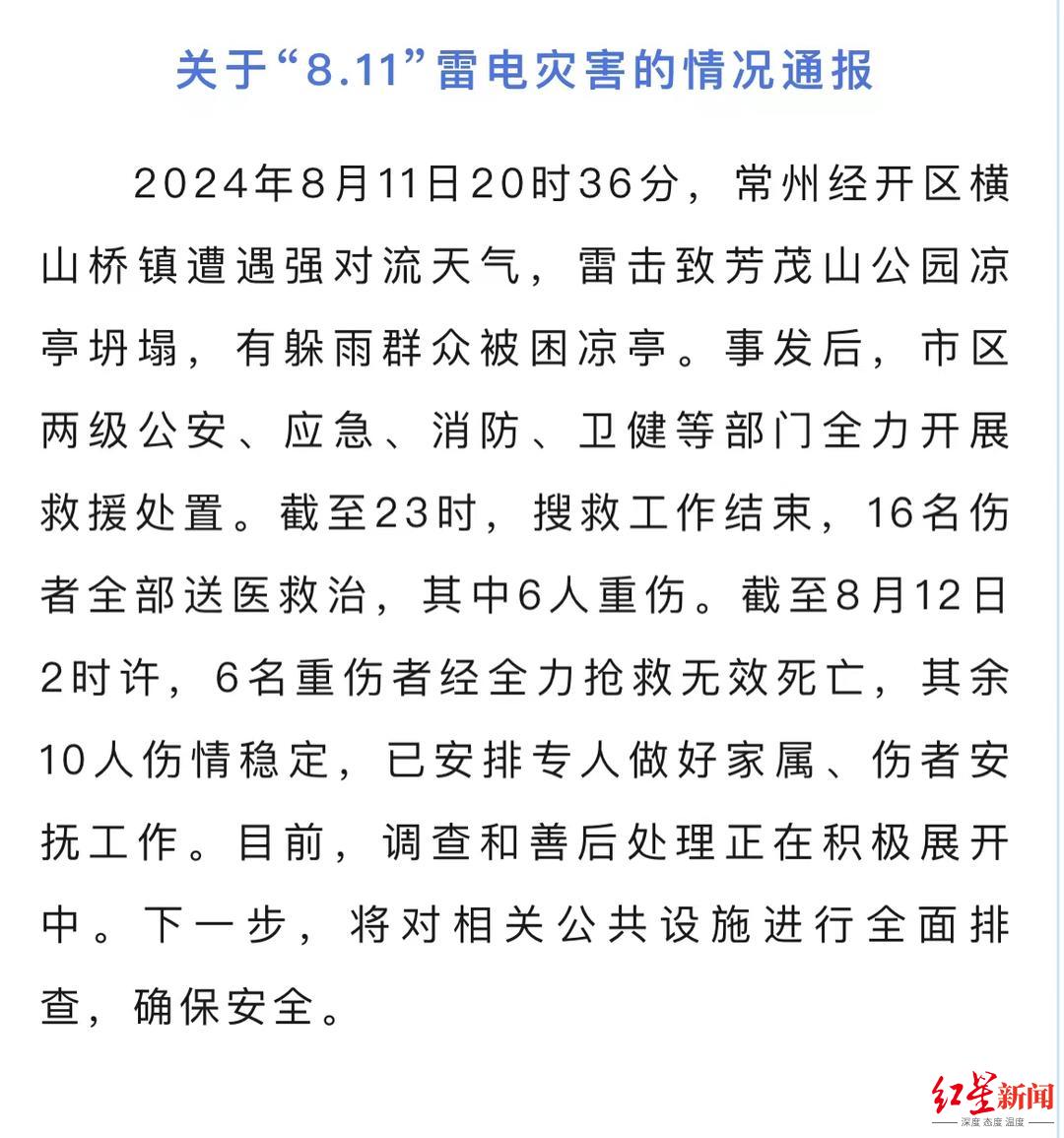 8月12日,江苏省常州经开区通报称,8月11日20时36分,常州经开区横山桥镇遭遇强对流天气,雷击致芳茂山公园凉亭坍塌,有躲雨群众被困凉亭。事发后,市区两级公安、应急、消防、卫健等部门全力开展救援处置。截至23时,搜救工作结束,16名伤者全部送医救治,其中6人重伤。截至8月12日2时许,6名重伤者经全力抢救无效死亡,其余10人伤情稳定,已安排专人做好家属、伤者安抚工作。目前,调查和善后处理正在积极展开中。