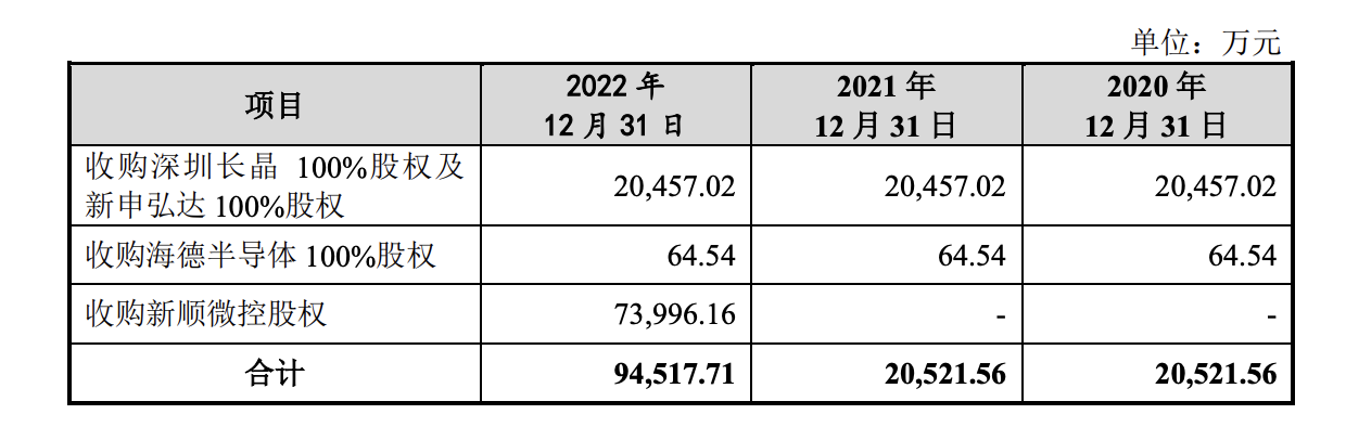 招股书资料显示,截至2022年3月末,长晶科技取得江苏新顺微电子股份有限公司(简称“新顺微”)67.11%直接或间接股权并控制新顺微89.28%表决权,实现对新顺微的控制,将其纳入合并报表范围;并确认2020年商誉7.40亿元。长晶科技在招股书中表示,公司聘请了中联资产评估集团有限公司对新顺微资产组截至2022年末的可回收金额进行了评估。经减值测试,新顺微资产组的可回收金额均高于其账面价值,商誉不存在减值迹象,因此未计提减值准备。