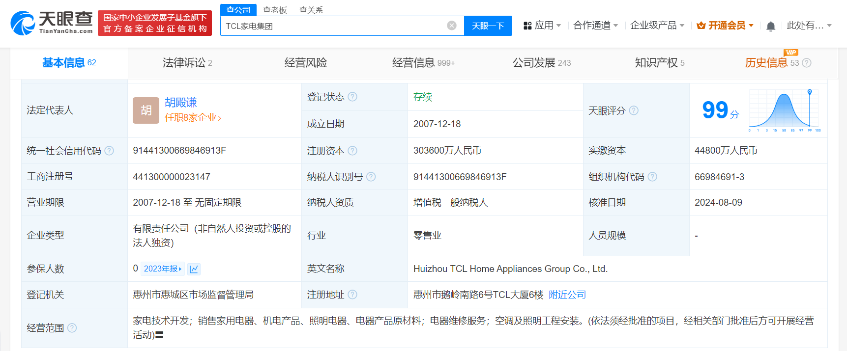 天眼查App显示,近日,TCL家电集团有限公司发生工商变更,注册资本由4.48亿人民币增至30.36亿人民币。该公司成立于2007年12月,法定代表人为胡殿谦,经营范围含家电技术开发,销售家用电器、机电产品、照明电器、电器产品原材料,电器维修服务,空调及照明工程安装,由TCL实业控股股份有限公司全资持股。