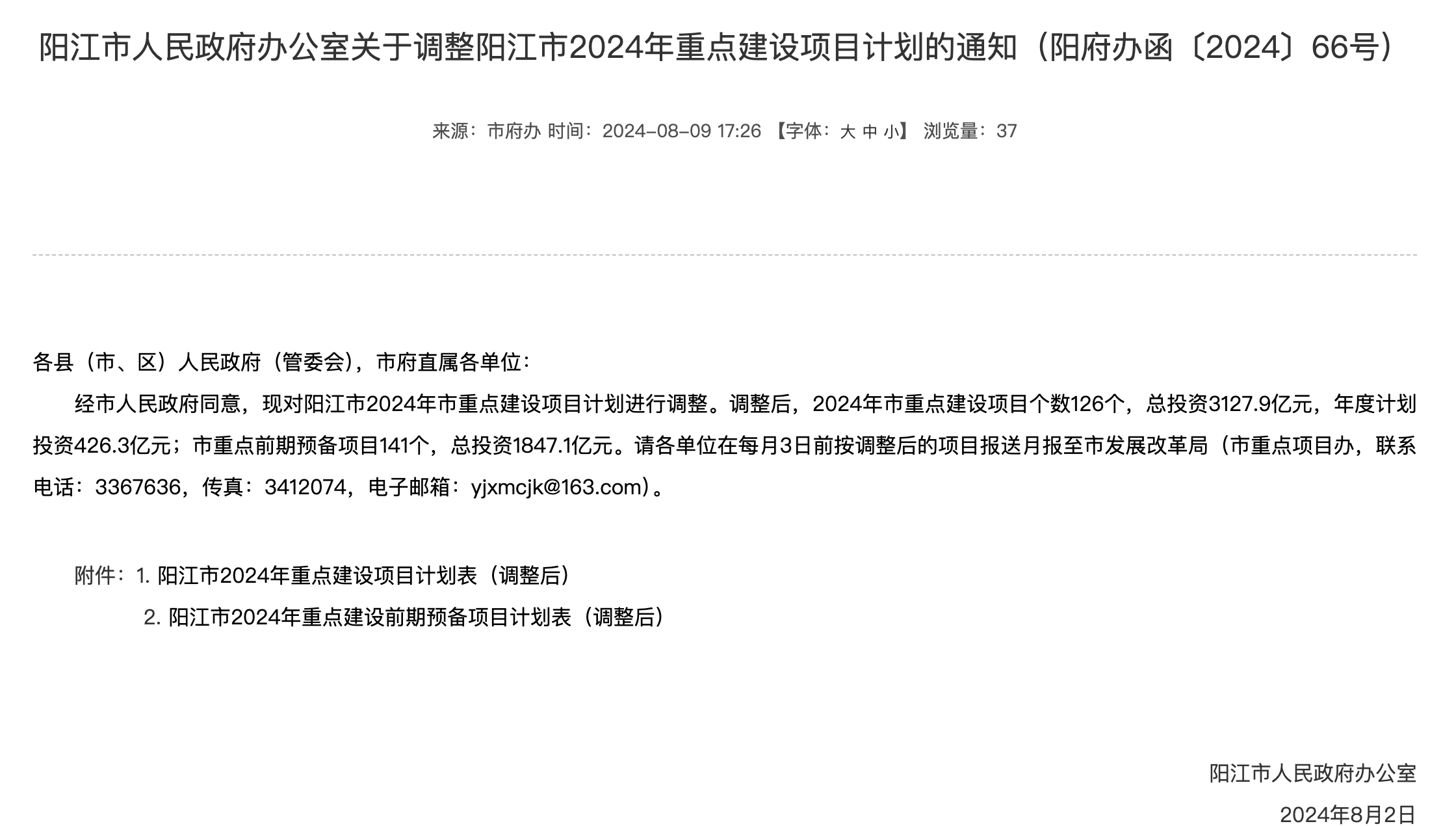 8月9日,广东阳江市政府公布《阳江市人民政府办公室关于调整阳江市2024年重点建设项目计划的通知》。