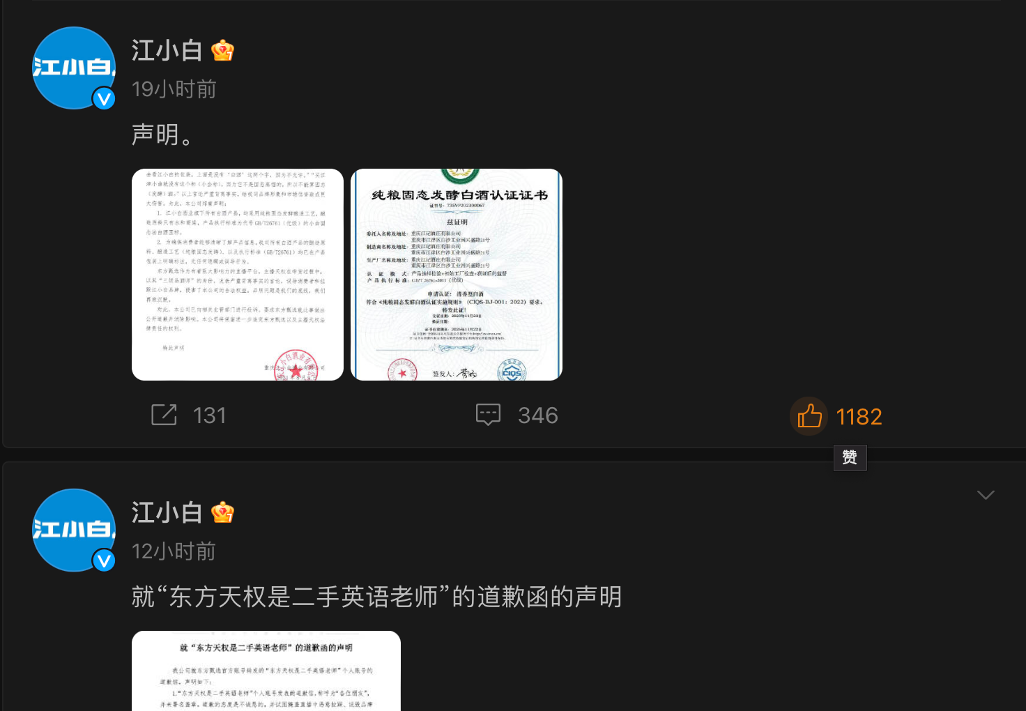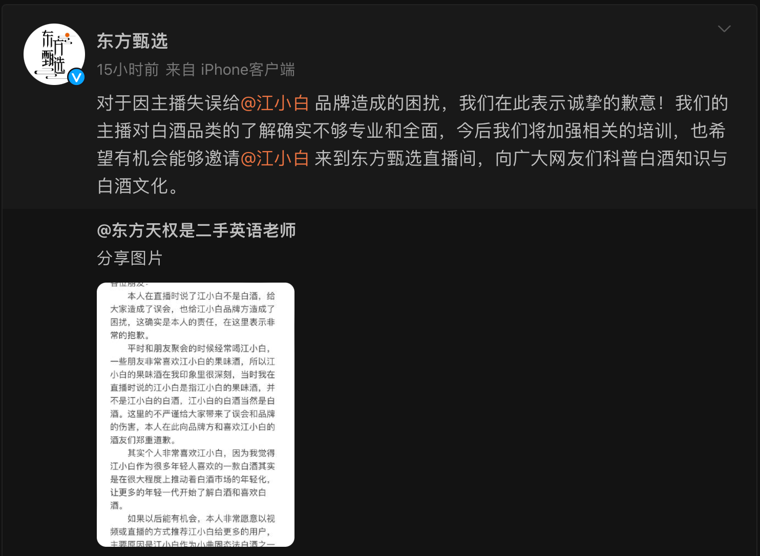同时,东方甄选官方账号也就此事致歉:“对于因主播失误给江小白品牌造成的困扰,在此表示诚挚的歉意。主播对白酒品类的了解确实不够专业和全面,今后将加强相关的培训,也希望有机会能够邀请江小白来到东方甄选直播间,向广大网友们科普白酒知识与白酒文化。”