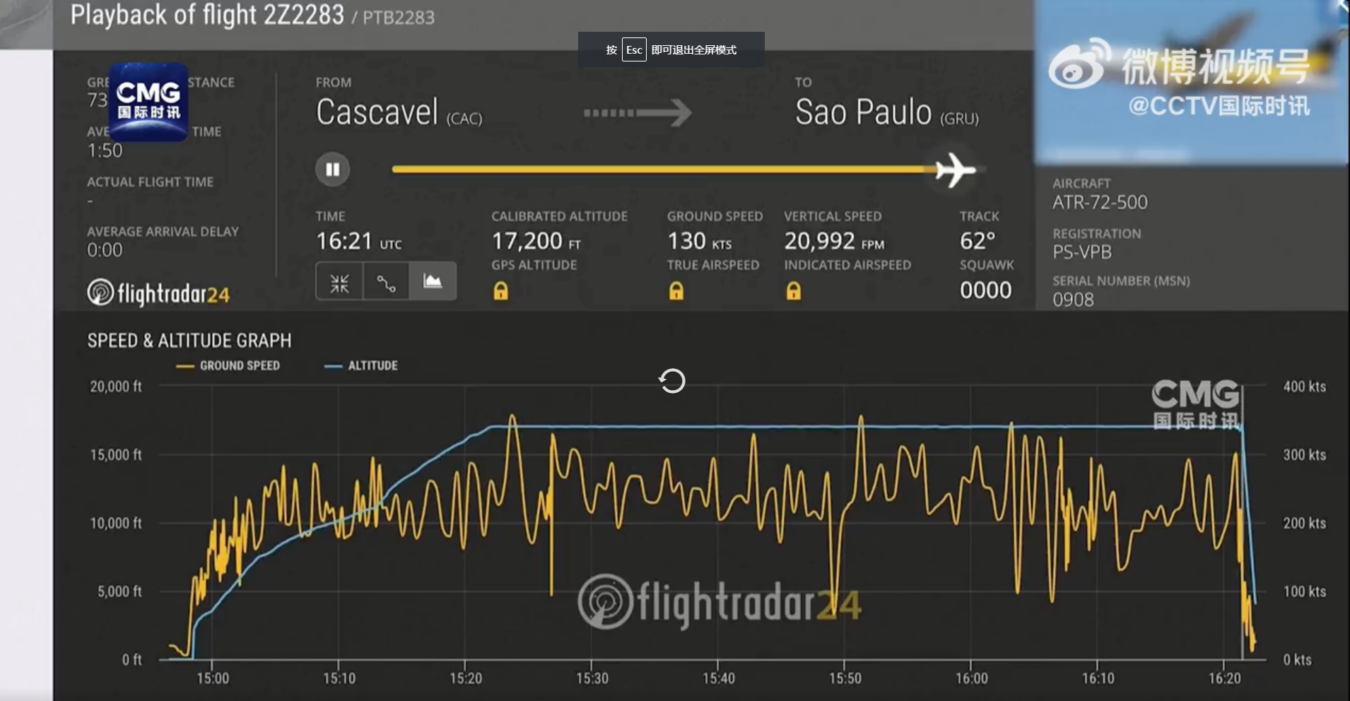 据CCTV国际时讯,飞机坠入巴西圣保罗州维涅杜的一处住宅区的花园。从飞行航班信息平台Flightradar24的数据来看,在当地时间8月9日下午1点21分之前,这架客机还保持在17000英尺(约合5182米)的高空飞行。从下午1点21分开始,客机飞行高度持续下降。与此同时,客机的垂直速度骤增且持续变化,最高可达每分钟24064英尺(约合每秒122.25米)。下午1点28分,圣保罗州消防部门收到第一个报警信息。下午3点半左右,巴西官方确认机上人员全部遇难。下午4点左右,确认坠机现场住宅区无伤亡。