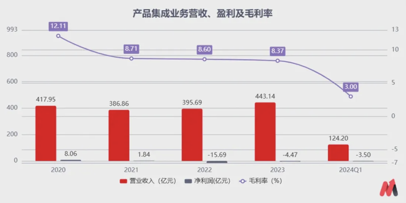 2022年公司的产品集成业务亏损15.69亿,2023年亏损有所收窄,亏损4.47亿,如果不算计提的商誉减值损失,净利润一度为正。但是到2024年一季度,公司产品集成业务的业绩再次出现了暴跌,实现营收124.20亿,单季度亏损3.5个亿。