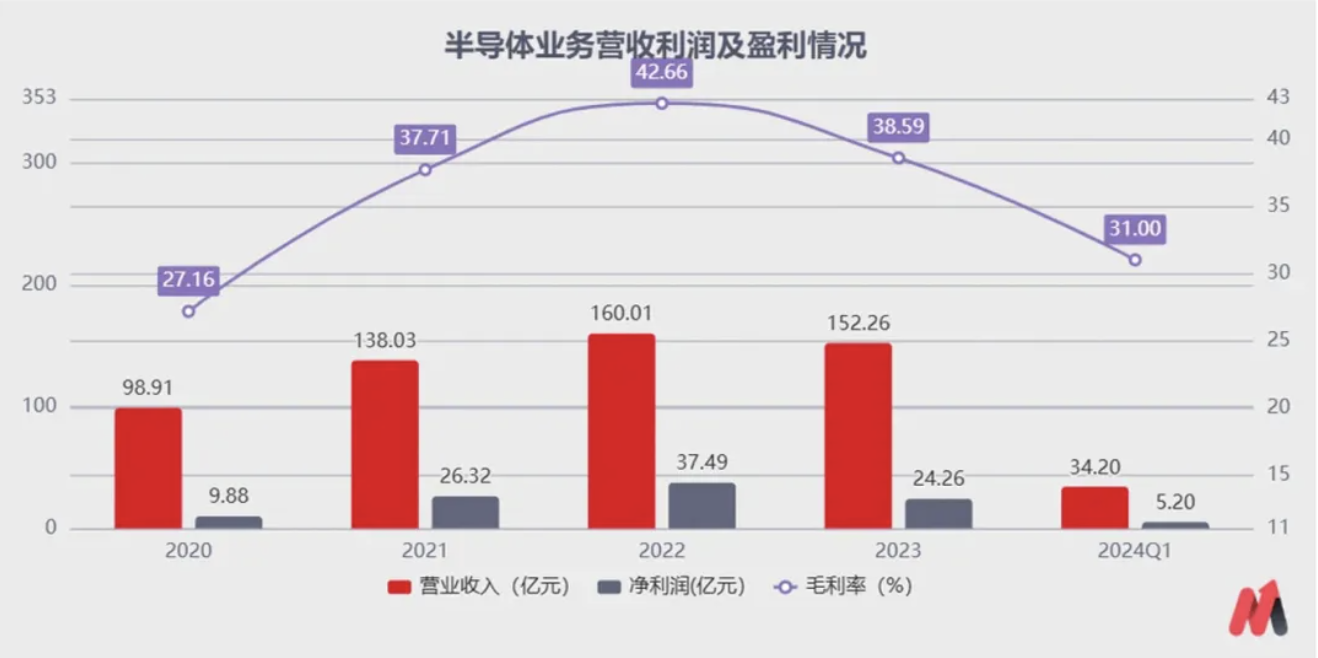 2024年Q1,闻泰科技的半导体业务实现营收34.20亿,同比下降9.9%,实现净利润5.2亿,同比下降21.2%,库存压力下,公司的毛利率持续下滑,从2022年的42.66%到今年的一季度只有31%左右。