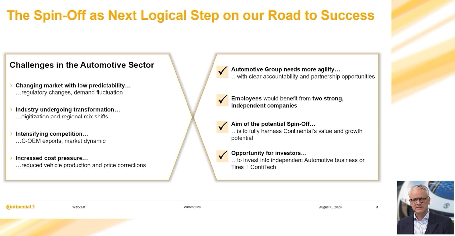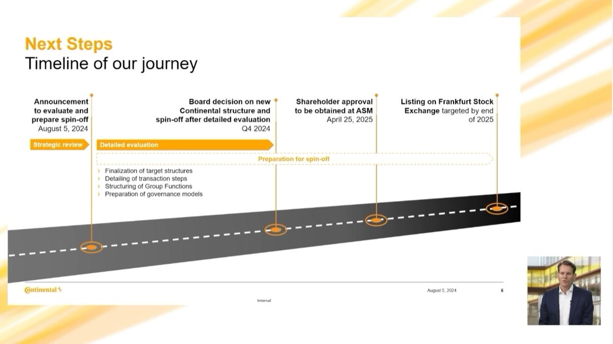 大陆集团董事会将在年底之前对分拆计划进行进一步审核,并将该计划在2025年4月的股东大会上交由全体股东表决。若董事会和股东大会均对分拆计划表示赞成,实际的分拆将在2025年底完成。