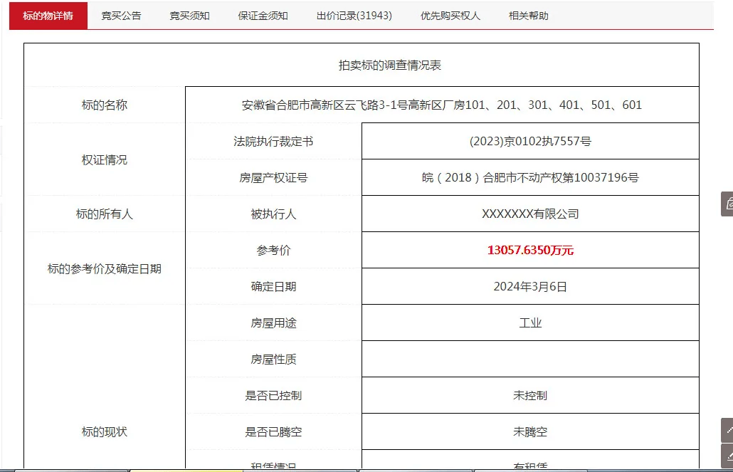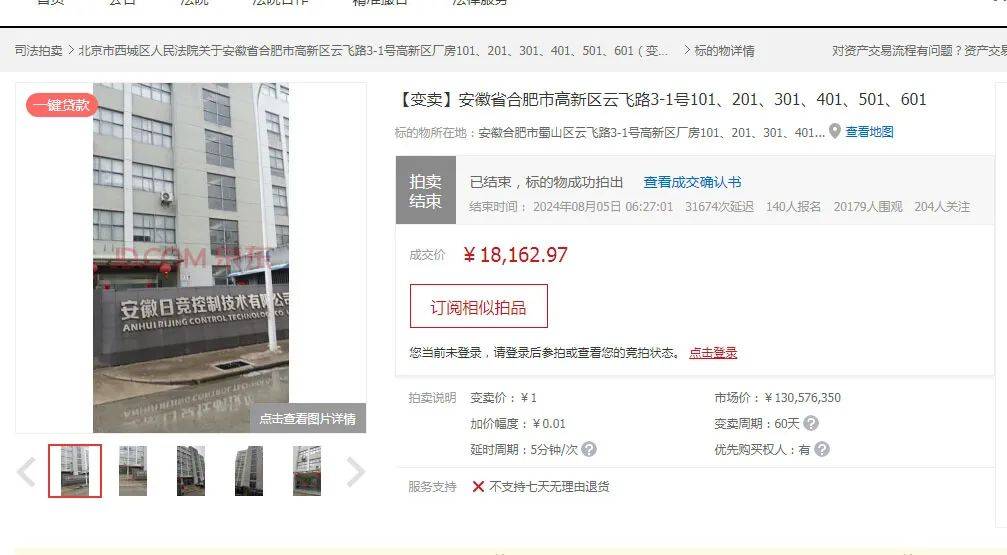 7月7日起,北京市西城区人民法院在京东资产交易平台发布公告。公告显示:北京市西城区人民法院将于2024年8月2日10时起(变卖期为60天)(竞价周期与延时除外)在北京市西城区人民法院京东网司法拍卖网络平台上进行公开变卖活动(法院账户名:北京市西城区人民法院)。该房屋总层数为6层,评估对象所在楼层为1-6层,总建筑面积为9550.64平方米,房屋结构为钢筋混凝土,规划用途为工业。