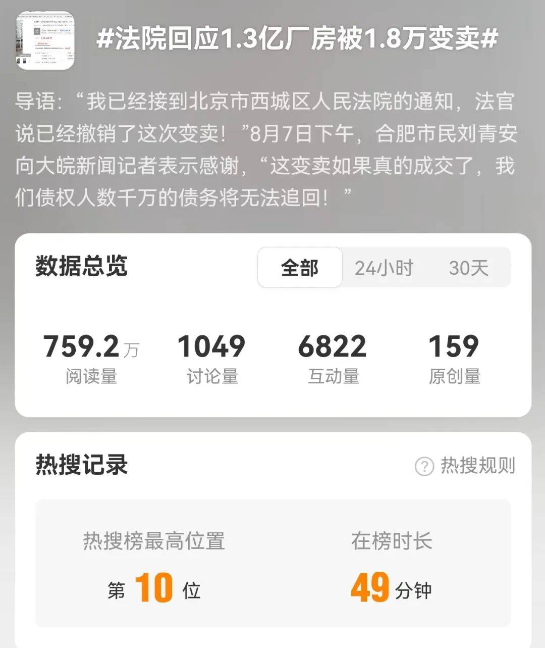 8月7日,有关本次变卖的内容已经被删除了。拍卖平台工作人员称:“你所查询的拍卖订单已被法院撤销。”西城区人民法院工作人员表示,法院对这一事件特别重视,正对组织人员认真核查,肯定会给公众一个满意答案。