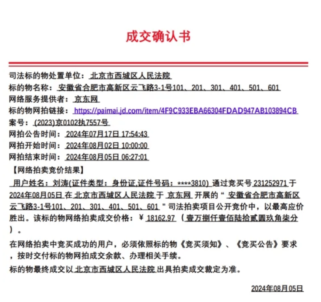 成交确认书显示,“捡漏”者是一位名叫刘涛的自然人,以18162.97元的最高价竞价成交这个价值1.3亿多元的标的。