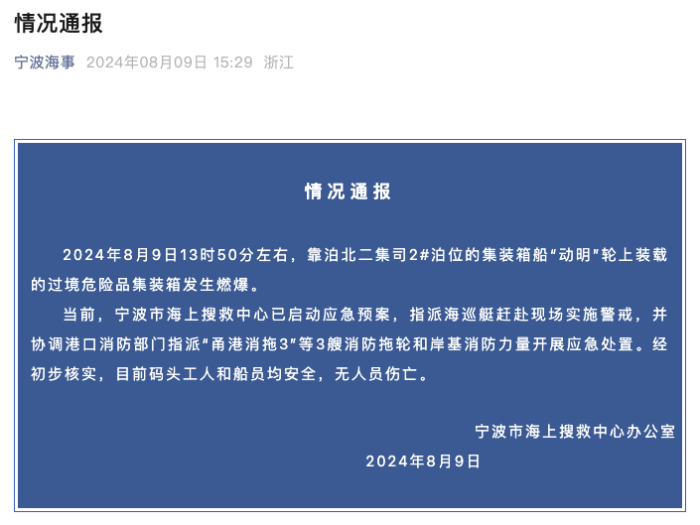 宁波市海上搜救中心办公室通报,8月9日13时50分左右,靠泊北二集司2#泊位的集装箱船“动明”轮上装载的过境危险品集装箱发生燃爆。当前,宁波市海上搜救中心已启动应急预案,指派海巡艇赶赴现场实施警戒,并协调港口消防部门指派“甬港消拖3”等3艘消防拖轮和岸基消防力量开展应急处置。经初步核实,目前码头工人和船员均安全,无人员伤亡。