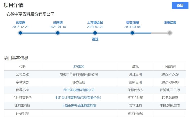 北交所网站显示,中草香料北交所IPO招股书在2022年12月29日获得受理,今年2月2日上会获得通过。若中草香料正式上市,中草香料也将成为2024年首个香料香精上市企业。