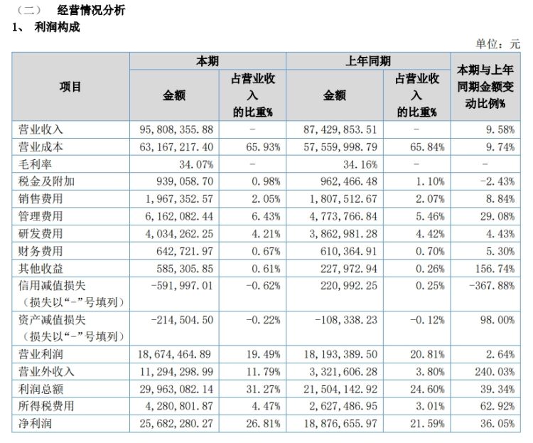 据利润构成显示,2024年上半年公司营业成本为6316.72万元,占营业收入比重为65.93%;与上年同期相比增加9.74%。