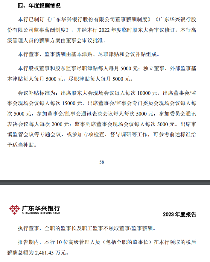 广东华兴银行此前发布的2023年财报显示,该行的董事、监事薪酬由基本津贴、尽职津贴和会议补贴组成。其中,股权董事和股东监事尽职津贴每人每月5000元;独立董事、外部监事基本津贴每人每月5000元,尽职津贴每人每月5000元。