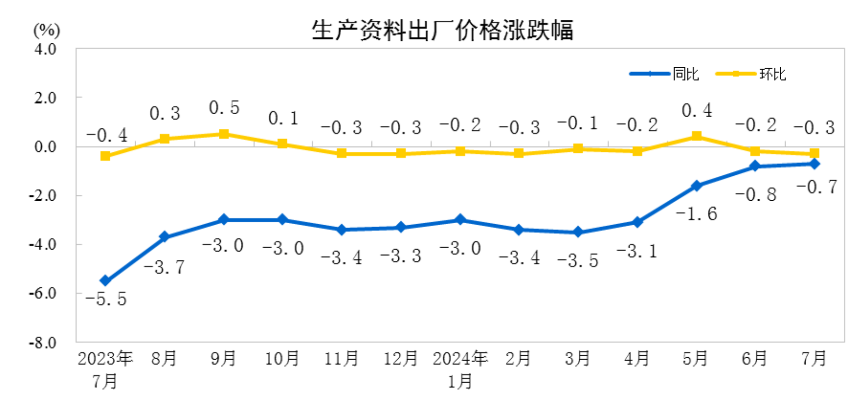 2024年7月份工业生产者出厂价格降幅与上月相同