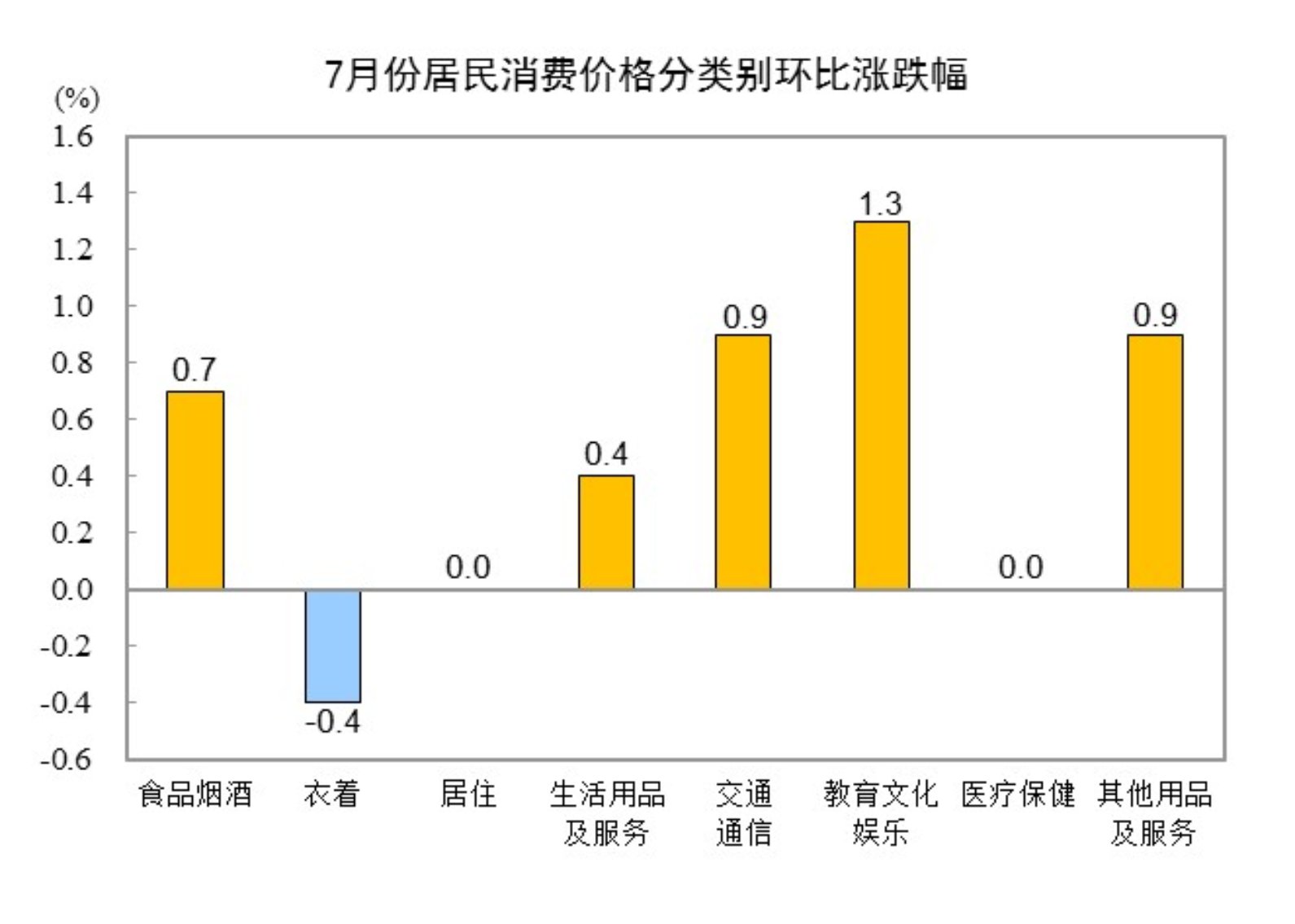 7月份,全国居民消费价格环比上涨0.5%。其中,城市上涨0.6%,农村上涨0.4%;食品价格上涨1.2%,非食品价格上涨0.4%;消费品价格上涨0.4%,服务价格上涨0.6%。
