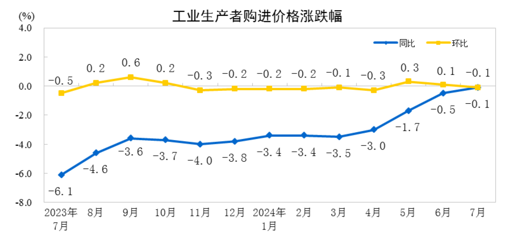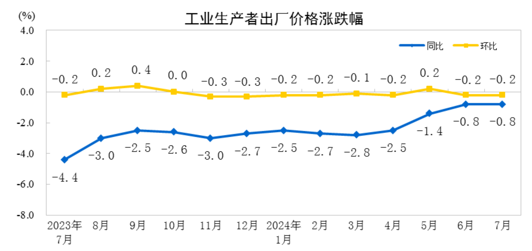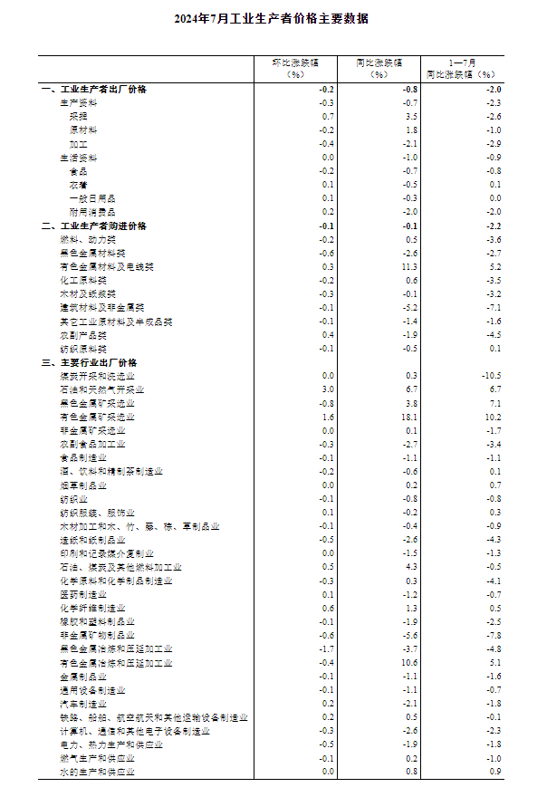 2024年7月份,全国工业生产者出厂价格同比下降0.8%,环比下降0.2%,降幅均与上月相同;工业生产者购进价格同比、环比均下降0.1%。1—7月平均,工业生产者出厂价格比上年同期下降2.0%,工业生产者购进价格下降2.2%。