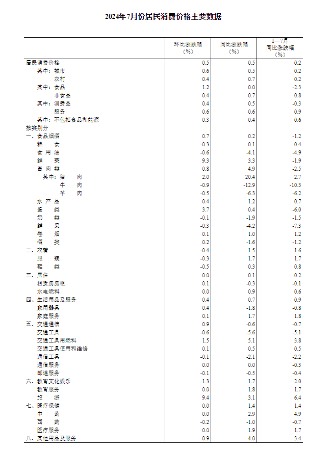 2024年7月份居民消费价格上涨0.5%