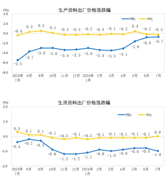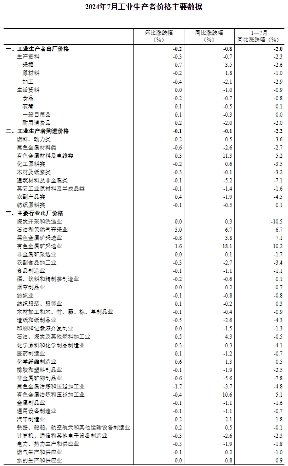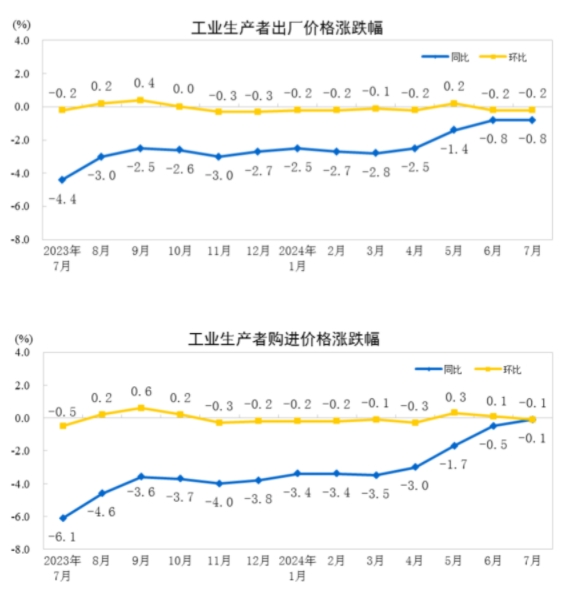 中新网8月9日电 据国家统计局网站消息,2024年7月份,全国工业生产者出厂价格同比下降0.8%,环比下降0.2%,降幅均与上月相同;工业生产者购进价格同比、环比均下降0.1%。1—7月平均,工业生产者出厂价格比上年同期下降2.0%,工业生产者购进价格下降2.2%。