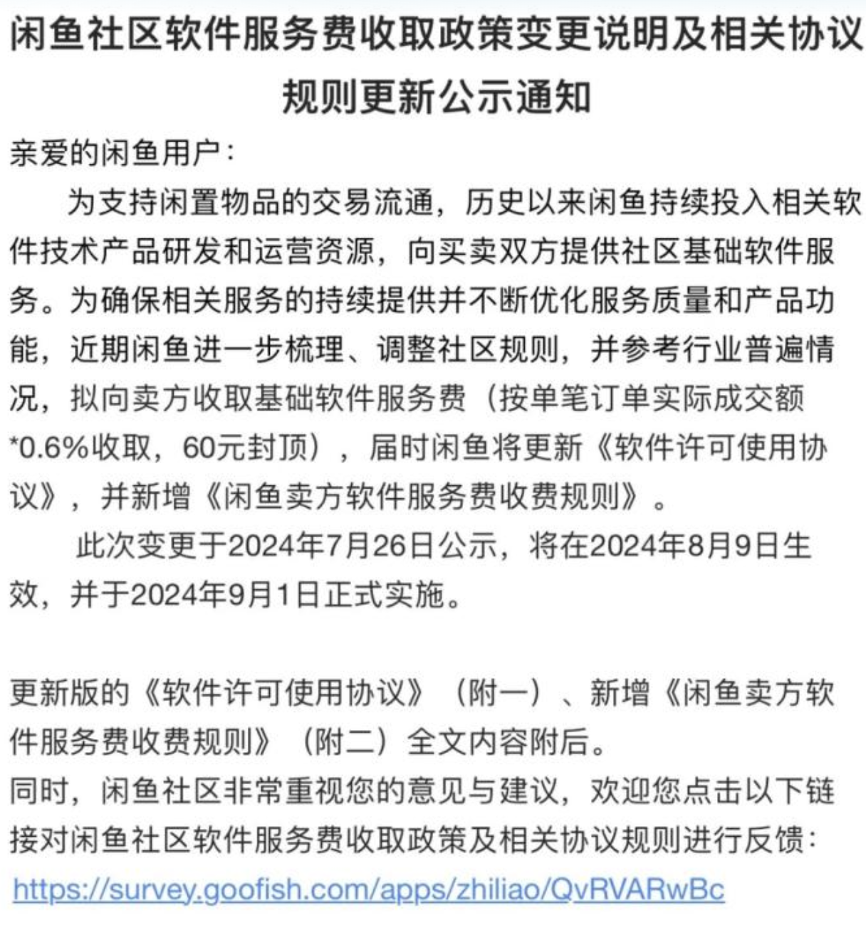 8月8日,闲鱼面向全体卖家收取0.6%的基础软件服务费(单笔最高收取60元)一事引发热议。闲鱼官方客服对此争议回应称,闲鱼软件服务费主要是围绕平台买卖双方交易持续投入的相关软件产品研发及运营资源,包括交易管理、数据存储、软件运营等必要成本,这是保障卖家经营顺畅、同时保障买家体验顺畅的必要软件服务。