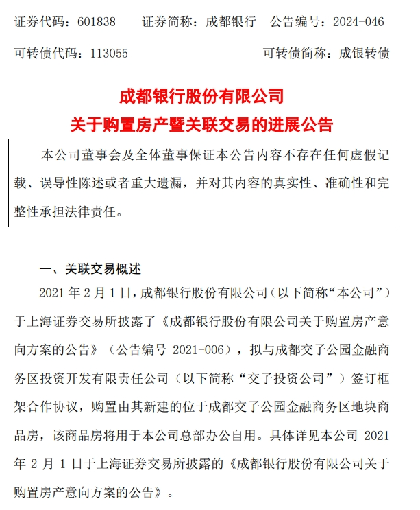 为了有效缓解办公场所紧张的情况,成都银行拟购置由成都交子公园金融商务区投资开发有限责任公司(以下简称“交子投资公司”)新建商品房,用于成都银行总部办公自用。据悉,该商品房位于成都交子公园金融总部产业园(四期)项目处。
