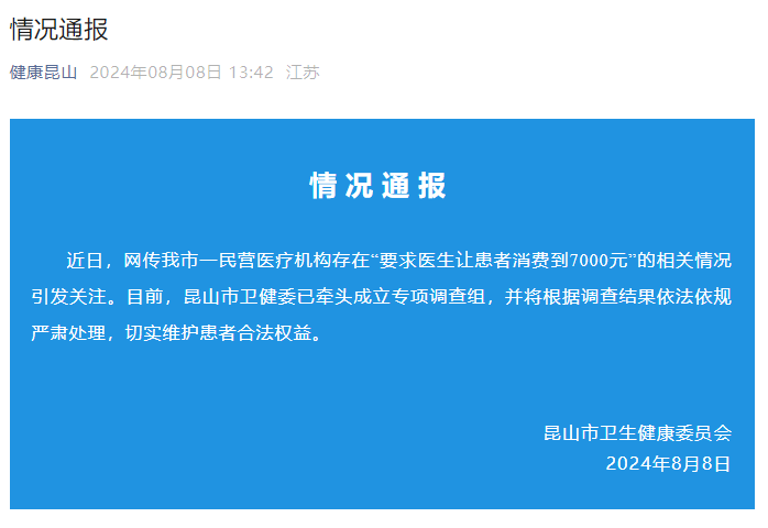 近日,网传我市一民营医疗机构存在“要求医生让患者消费到7000元”的相关情况引发关注。目前,昆山市卫健委已牵头成立专项调查组,并将根据调查结果依法依规严肃处理,切实维护患者合法权益。