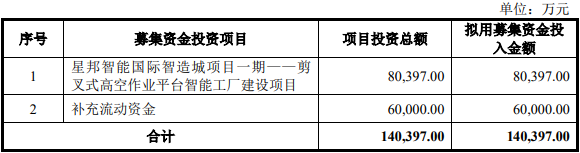 星邦智能原拟在上交所主板公开发行股票不超过4,777.00万股,占发行后总股本的比例不低于25.00%。星邦智能原拟募集资金140,397.00万元,分别用于星邦智能国际智造城项目一期——剪叉式高空作业平台智能工厂建设项目、补充流动资金。
