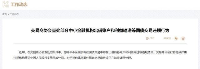 交易商协会网站消息,近期,在交易商协会查处的案件中,部分中小金融机构在国债交易中存在出借债券账户和利益输送等违规情形,交易商协会已将部分严重违规机构移送中国人民银行实施行政处罚,对于其他此类案件线索交易商协会正在加紧调查处理。
