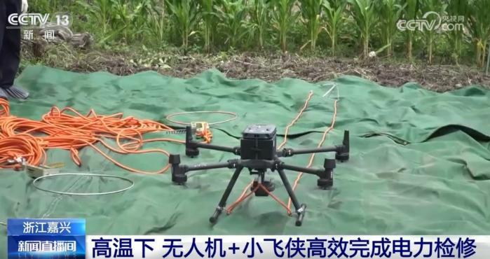 在浙江嘉兴,这几天的最高气温都在38℃以上,为了保障用电安全,电力运维人员加密了电路检修频次。如何在高温天气下高效又安全地完成作业?运维人员采用了“无人机+小飞侠”的方式,“小飞侠”是一个类似简易电梯的电动升降机,它能把作业人员送至高百米的空中作业,不仅节省检修人员的体力,还能缩短检修时间。