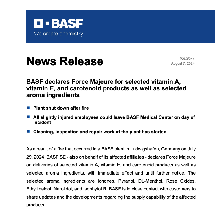 巴斯夫在公告中确认,除了前面提到的维生素A、维生素E、类胡萝卜素产品外,包括紫罗兰酮、吡喃醇、DL-薄荷醇、玫瑰氧化物、乙基橙花醇、橙花叔醇和异植物醇在内的芳香组分产品生产也受影响中断。对这些产品交付宣布不可抗力即日生效,直至另行通知。