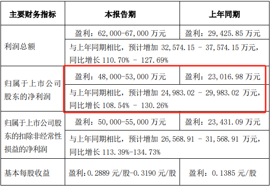 公司上半年业绩实现倍增。日前披露的业绩预告显示,公司上半年实现归母净利润4.80亿元至5.30亿元,同比增长108.54%至130.26%。