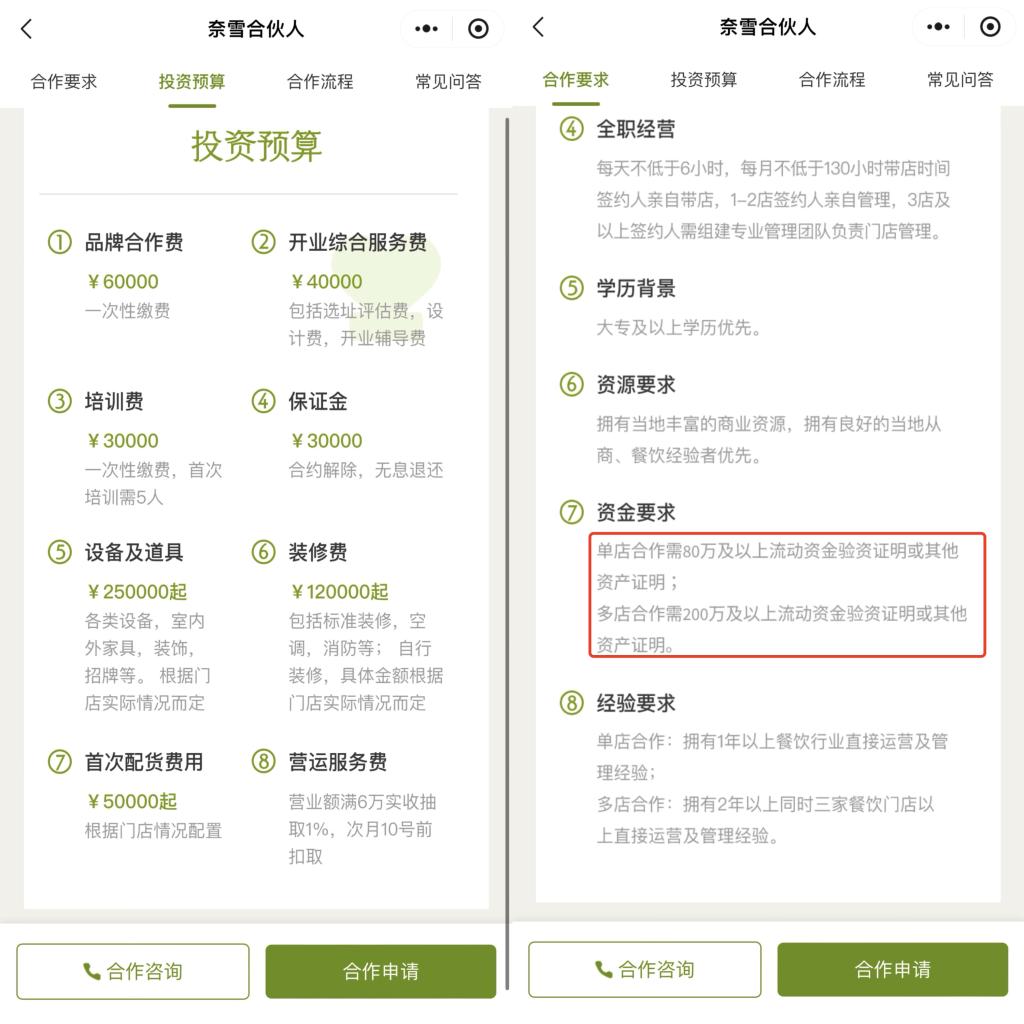 “奈雪的茶合伙人”小程序显示,奈雪单店合作要求出具80万元及以上的流动资金验资证明,多店合作则要求在200万元及以上;此外,根据其给出的品牌合作费用、保证金、客店综合服务费等各项投资预算,合计需要约40多万元。