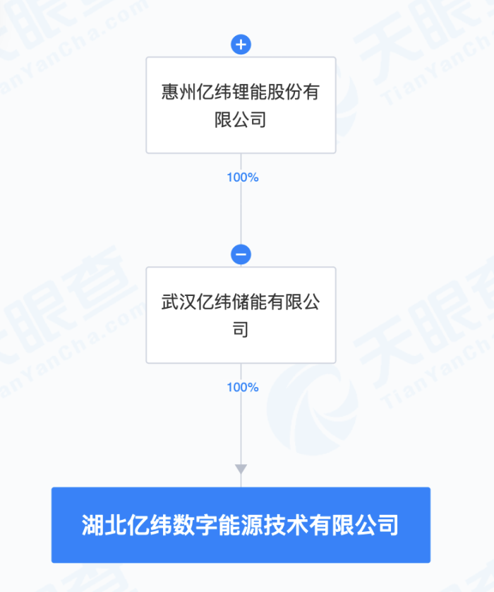 天眼查APP显示,近日,湖北亿纬数字能源技术有限公司成立,法定代表人为刘怡青,注册资本1000万元,经营范围包含:合同能源管理;储能技术服务;节能管理服务;蓄电池租赁等。天眼查股权穿透显示,该公司由亿纬锂能间接全资持股。