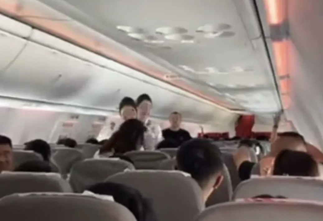图片来源:抖音@新京报 截图,在视频中,乘客不停煽动着手中的纸板,乘务员端着水来回安抚乘客。