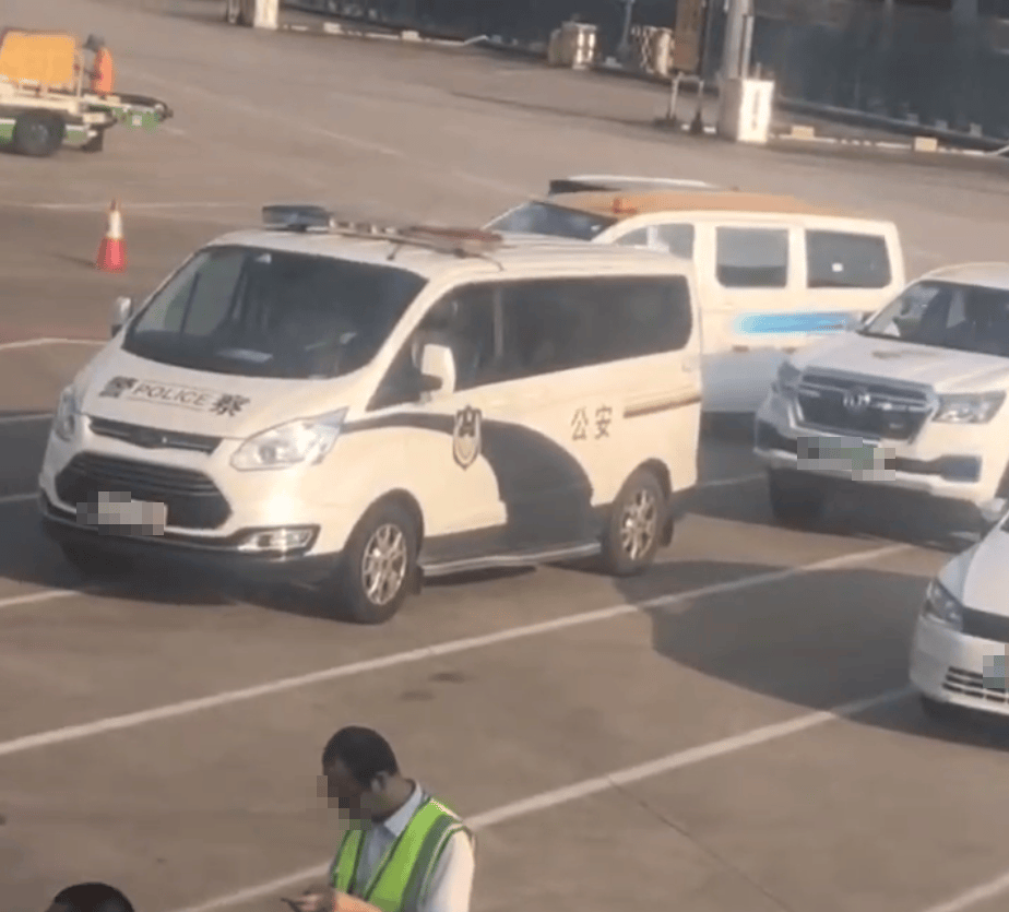 视频显示,在飞机登机扶梯处,停放着一辆警车,现场有身穿公安制服的工作人员与身穿“航服”荧光马甲的工作人员。视频定位为广州白云国际机场。